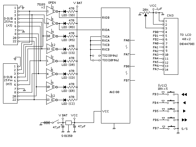 (HD44780)を使用し、RS232Cの通信ラインの中間に入れ、 送受